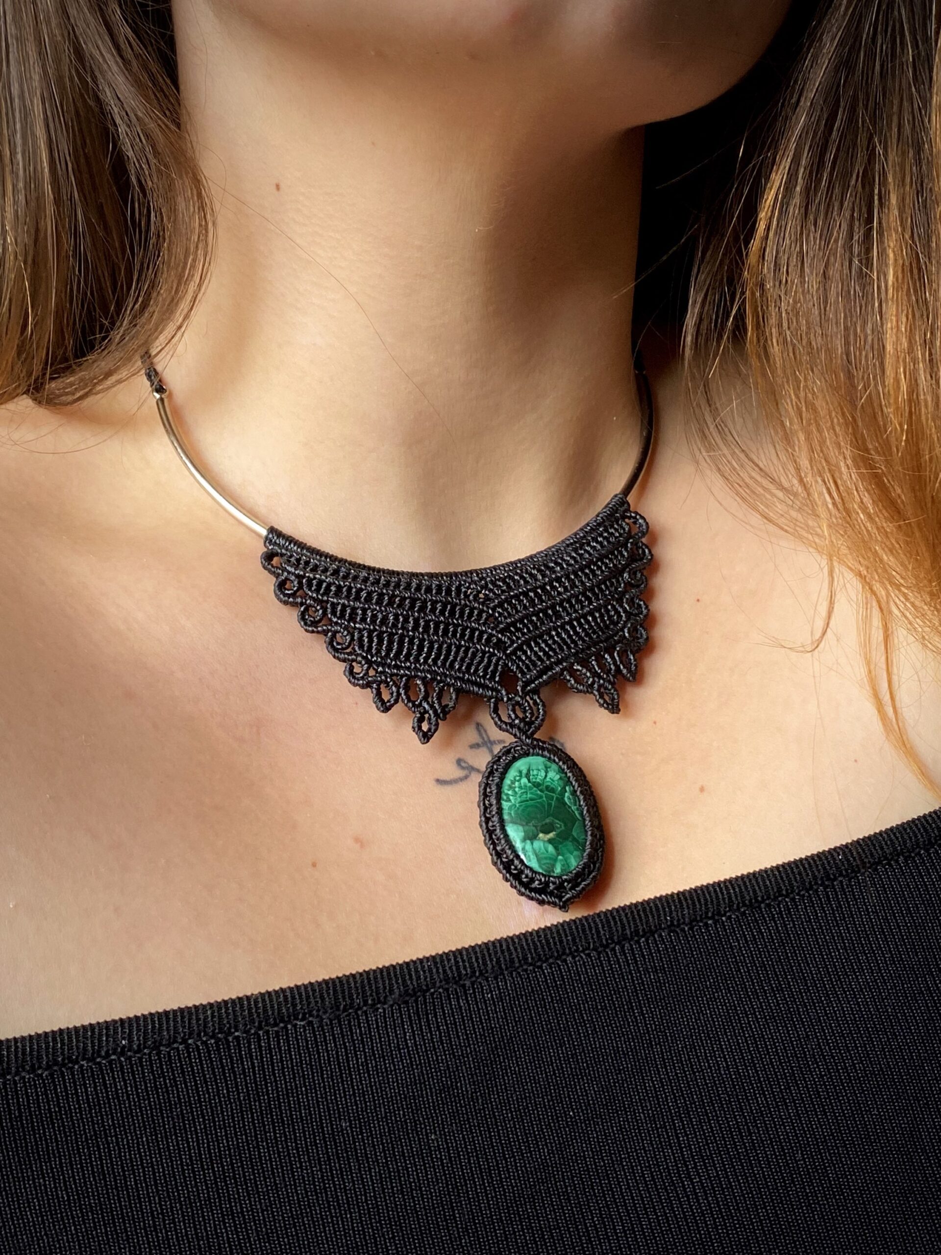 Colar com base metálica e pedra Malaquita