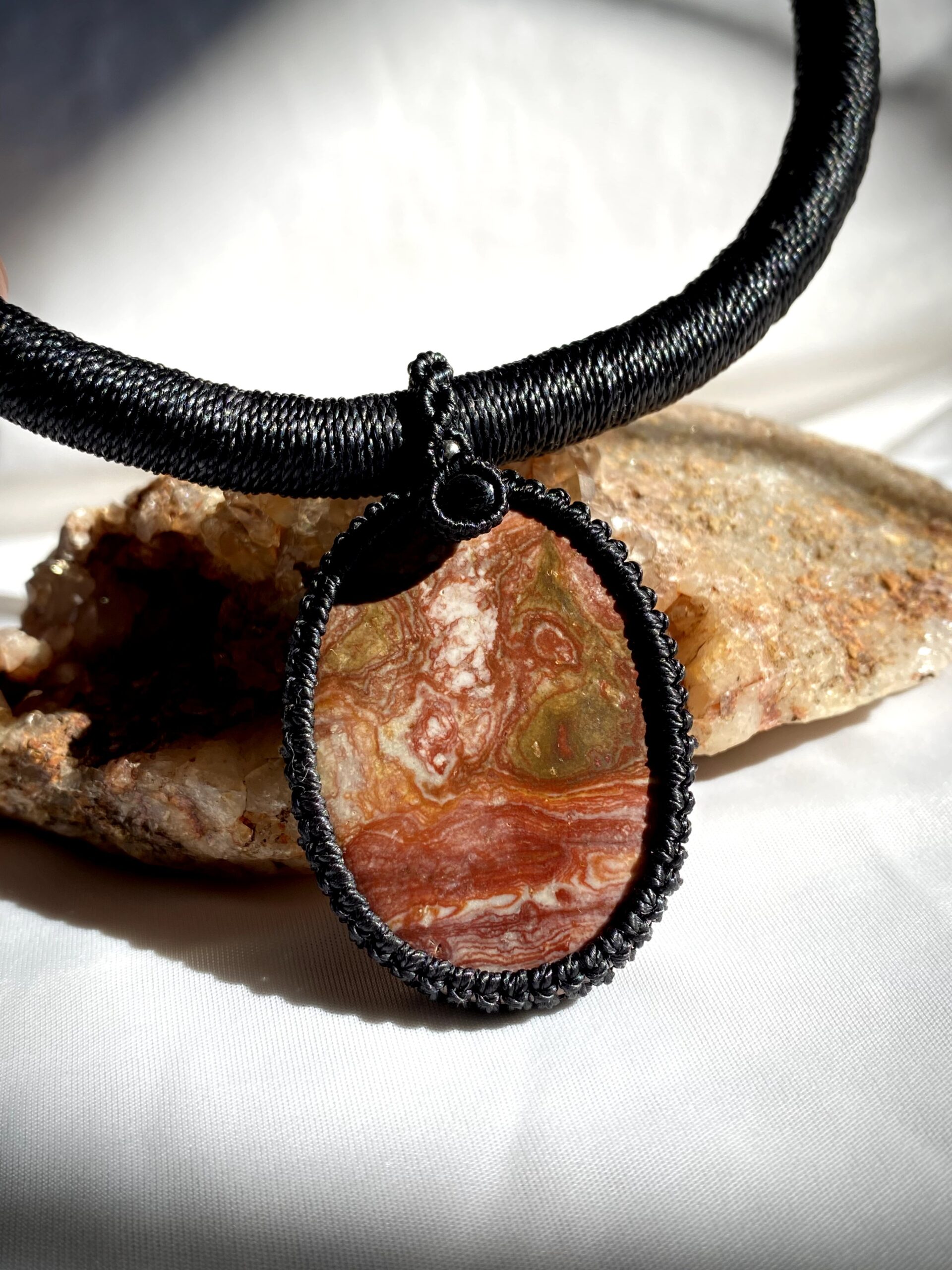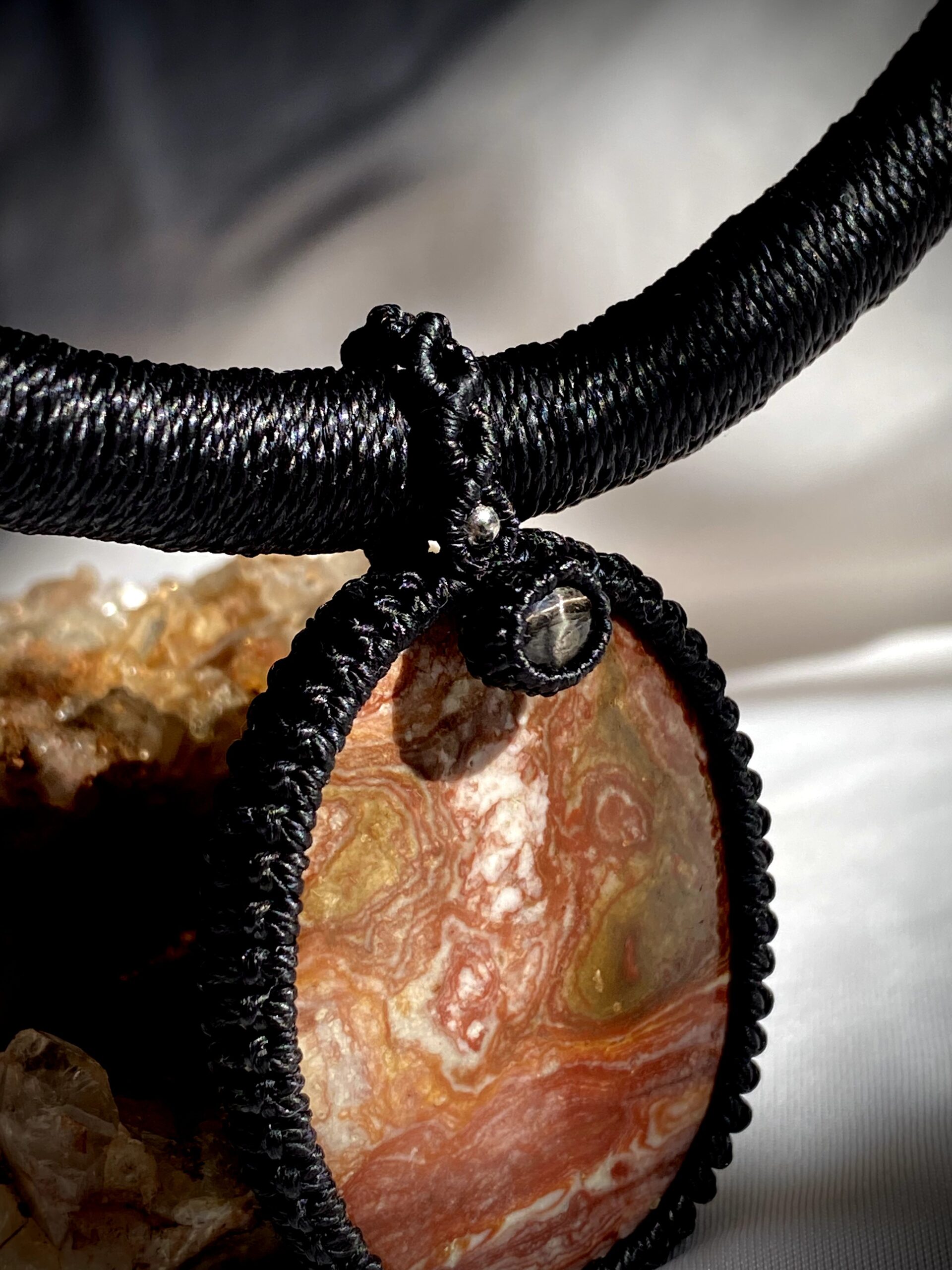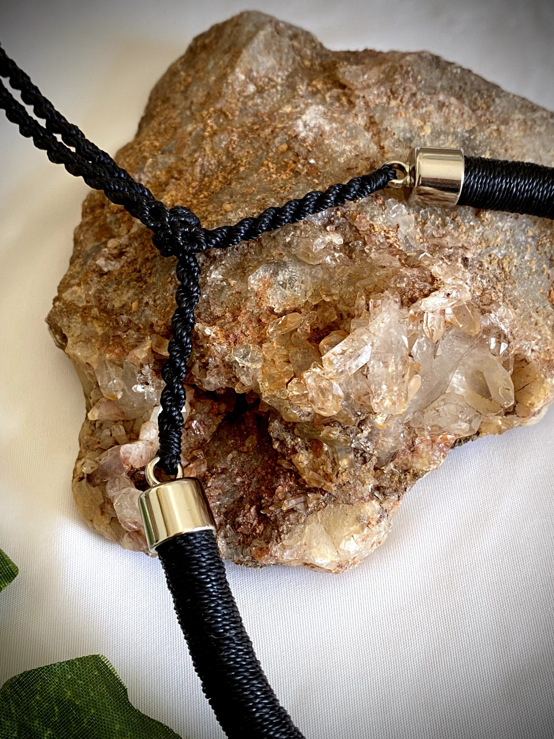 O fio preto proporciona contraste perfeito com as pedras e os metais, além de reforçar a elegância da peça e permitir combinações com diferentes estilos de roupa.