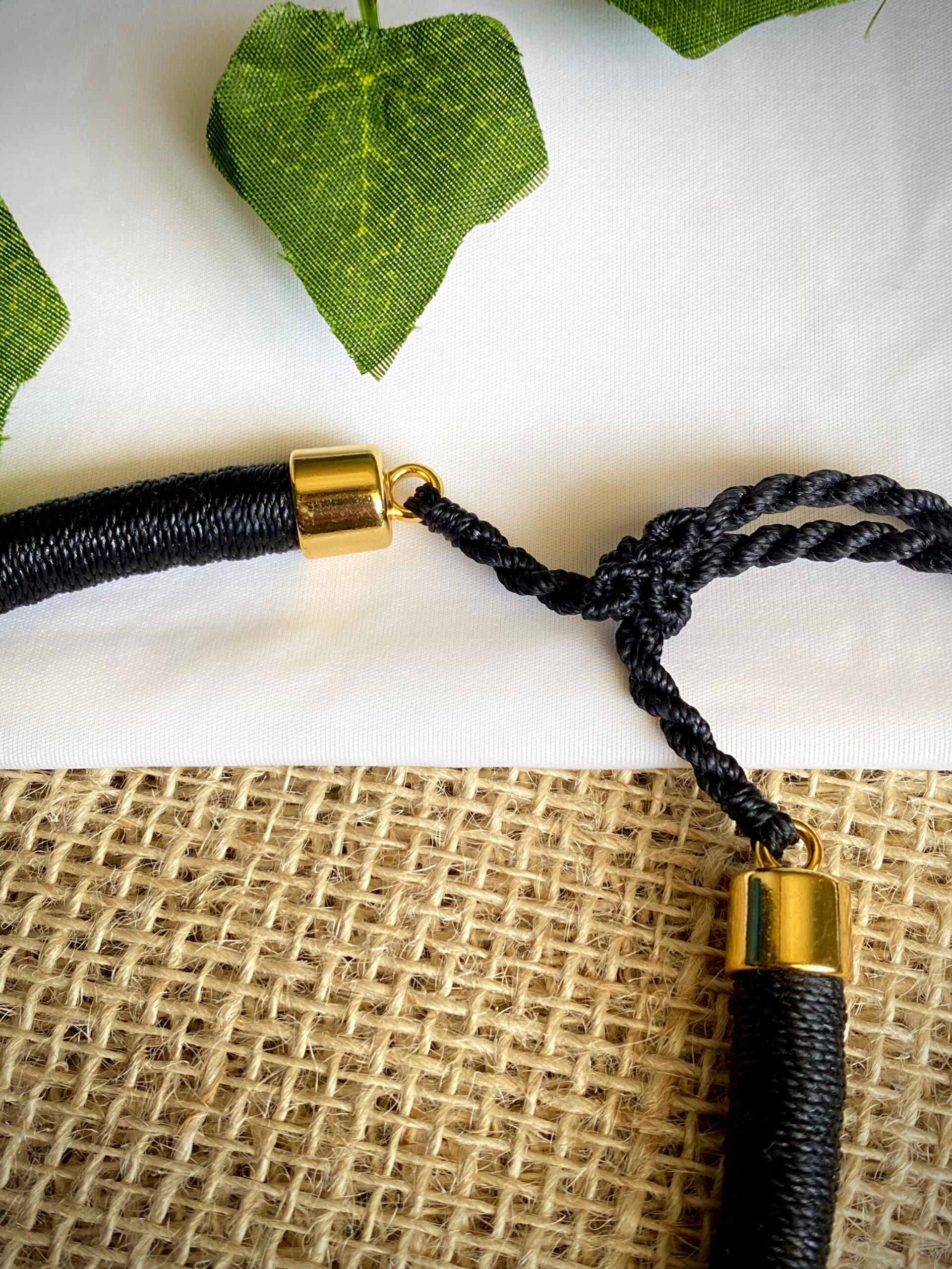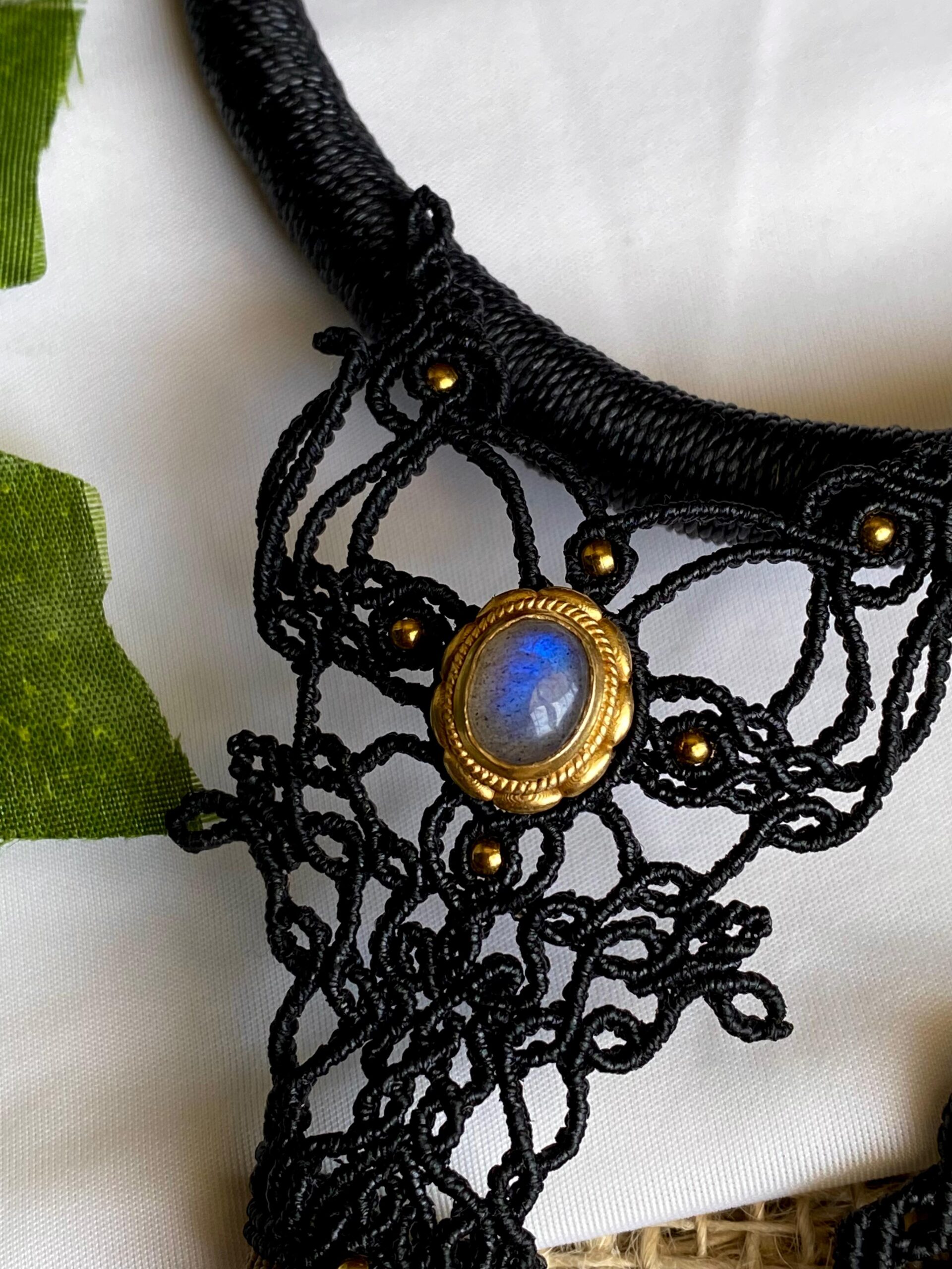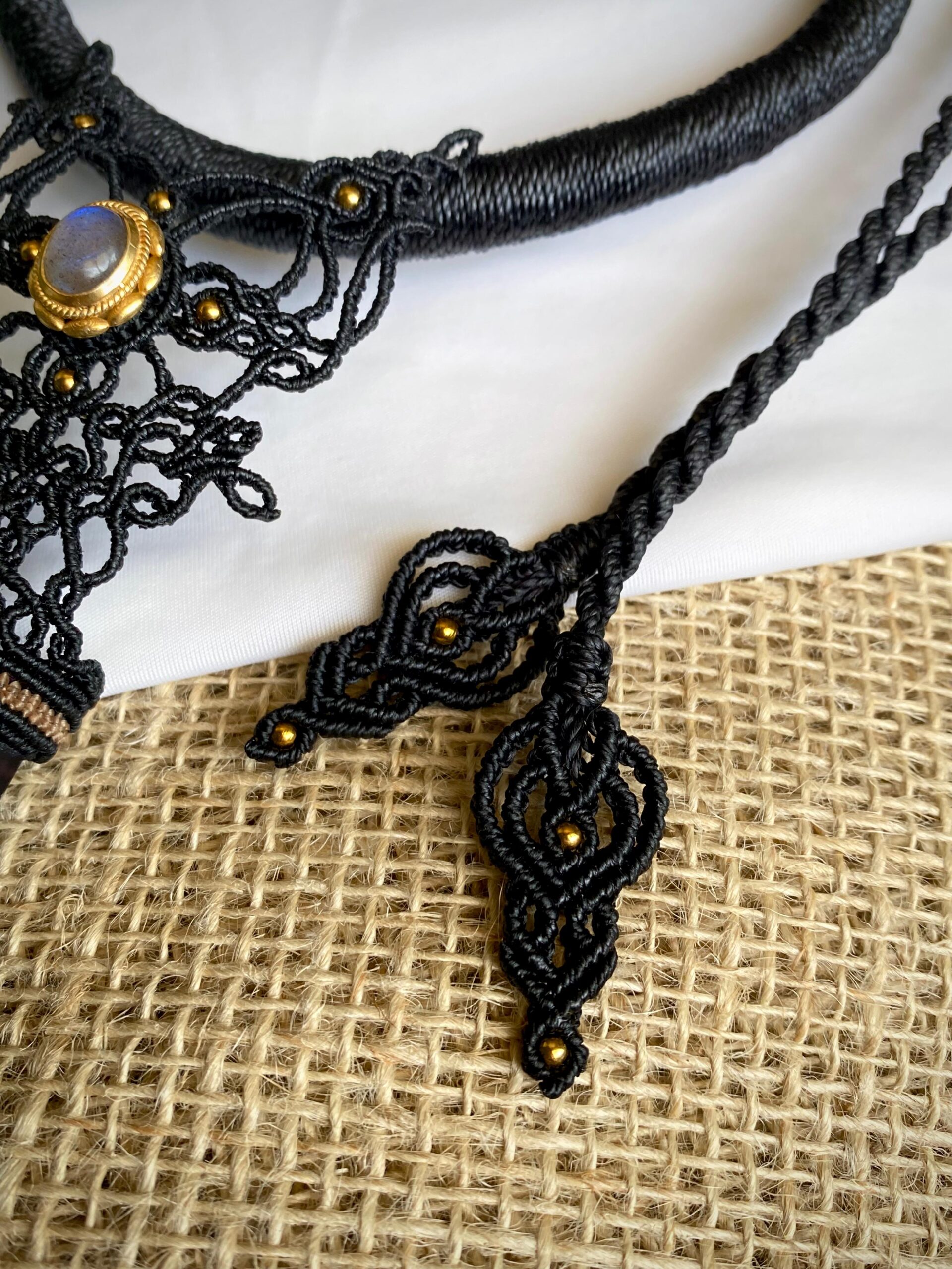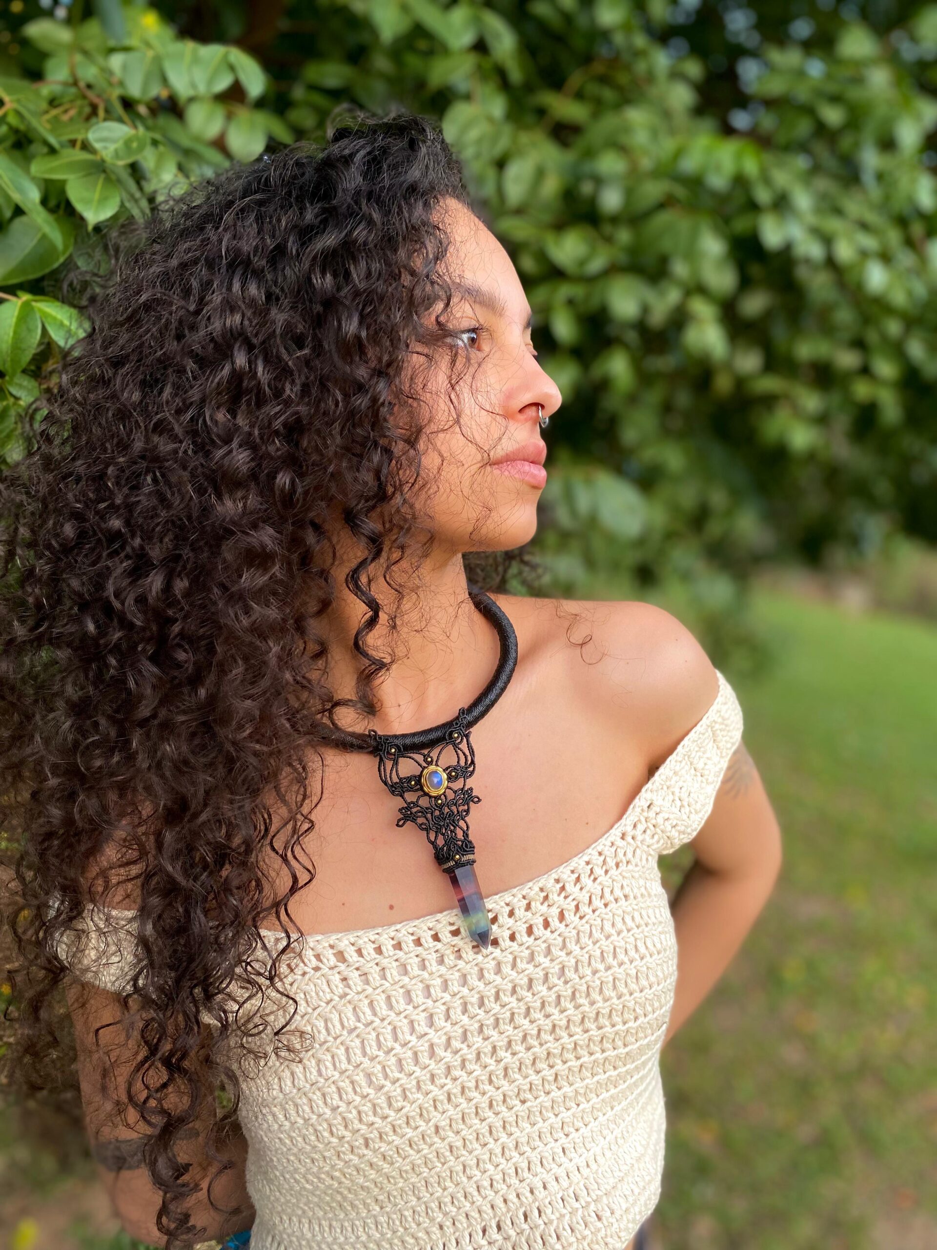 Este colar foi cuidadosamente confeccionado em micro macramê com fio de 0,5mm, unindo resistência, leveza e delicadeza. As cores escolhidas – preto e marrom/bege claro – criam um contraste sofisticado que valoriza tanto os detalhes quanto a beleza natural das pedras. A peça possui ajuste regulável, permitindo diferentes comprimentos e usos versáteis.