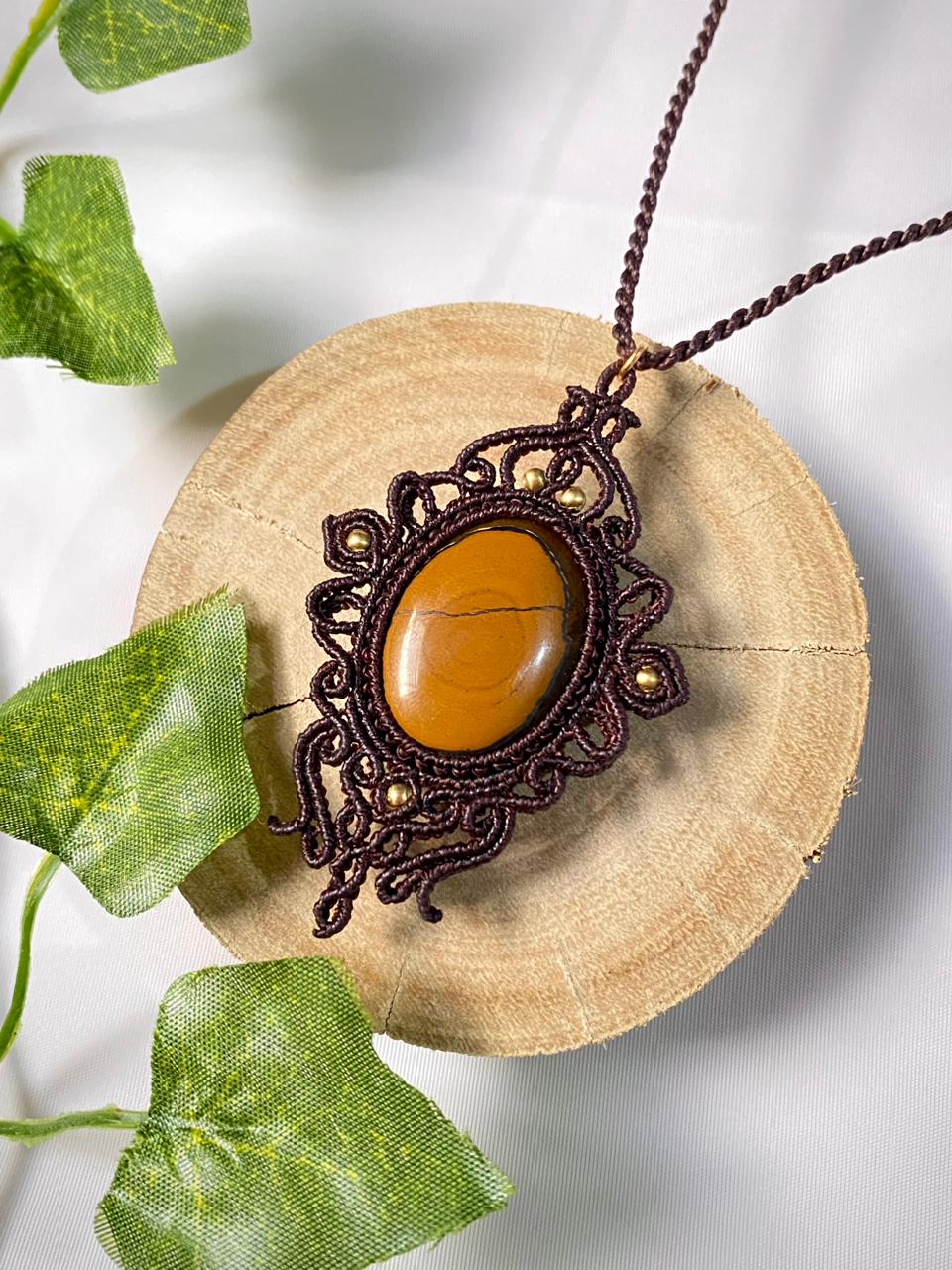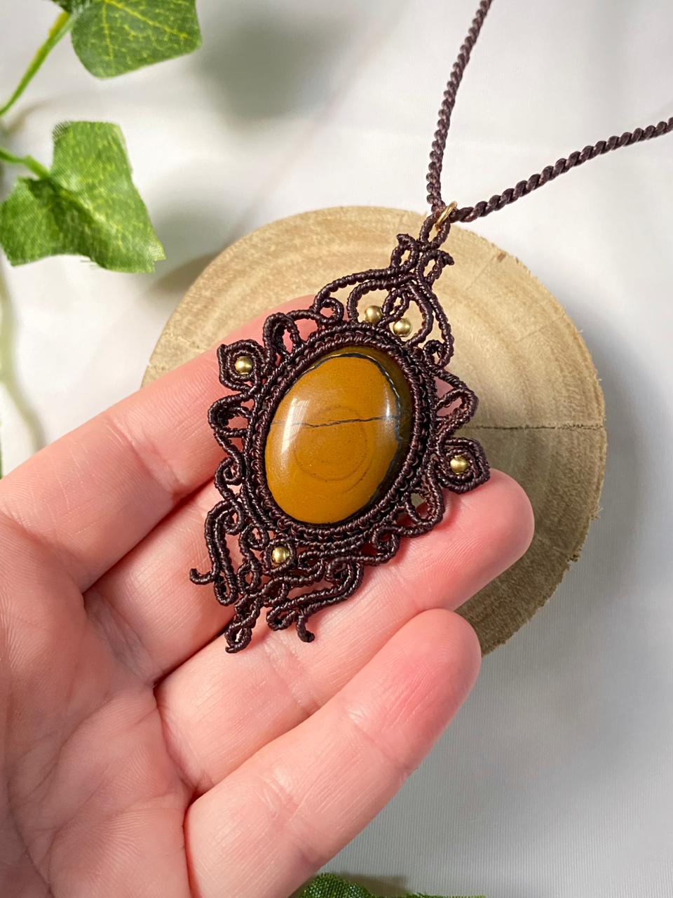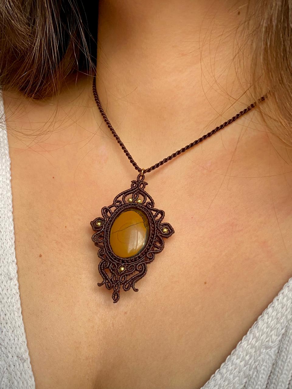 Cada detalhe do colar é feito manualmente com fio de 0,5mm, garantindo delicadeza e resistência. O fio marrom escuro confere sofisticação, combinando perfeitamente com a tonalidade da pedra central e os elementos dourados, criando um visual equilibrado e atemporal.