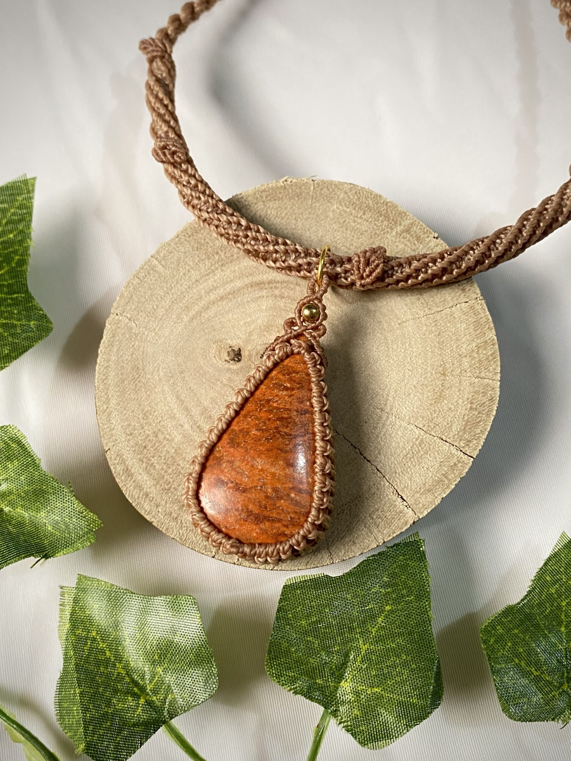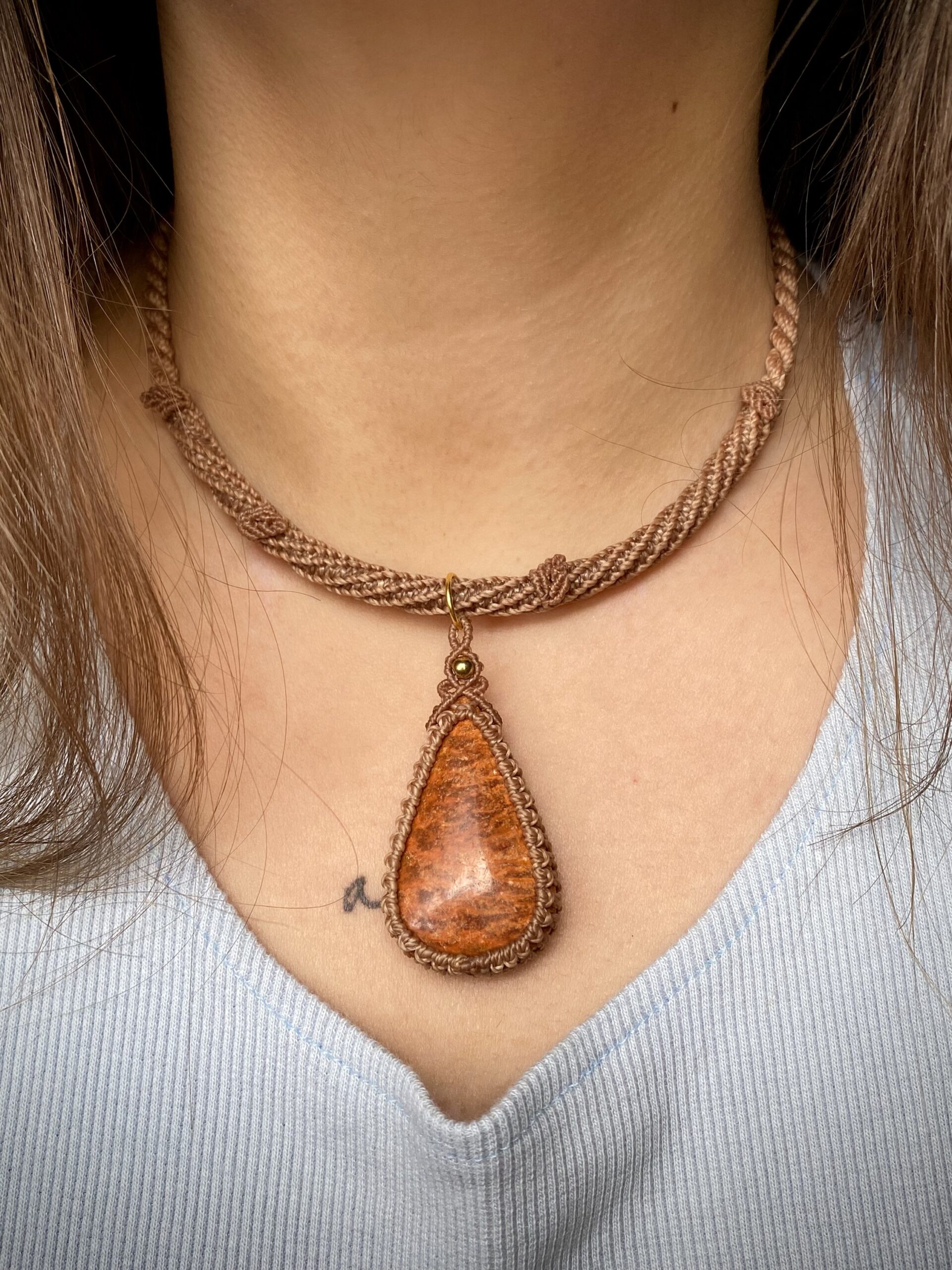 Cada detalhe é feito à mão com a técnica do macramê, valorizando a tradição do trabalho artesanal. O fio, nas cores marrom, bege e claro, cria uma harmonia visual suave, que se conecta perfeitamente com a tonalidade vibrante da pedra.