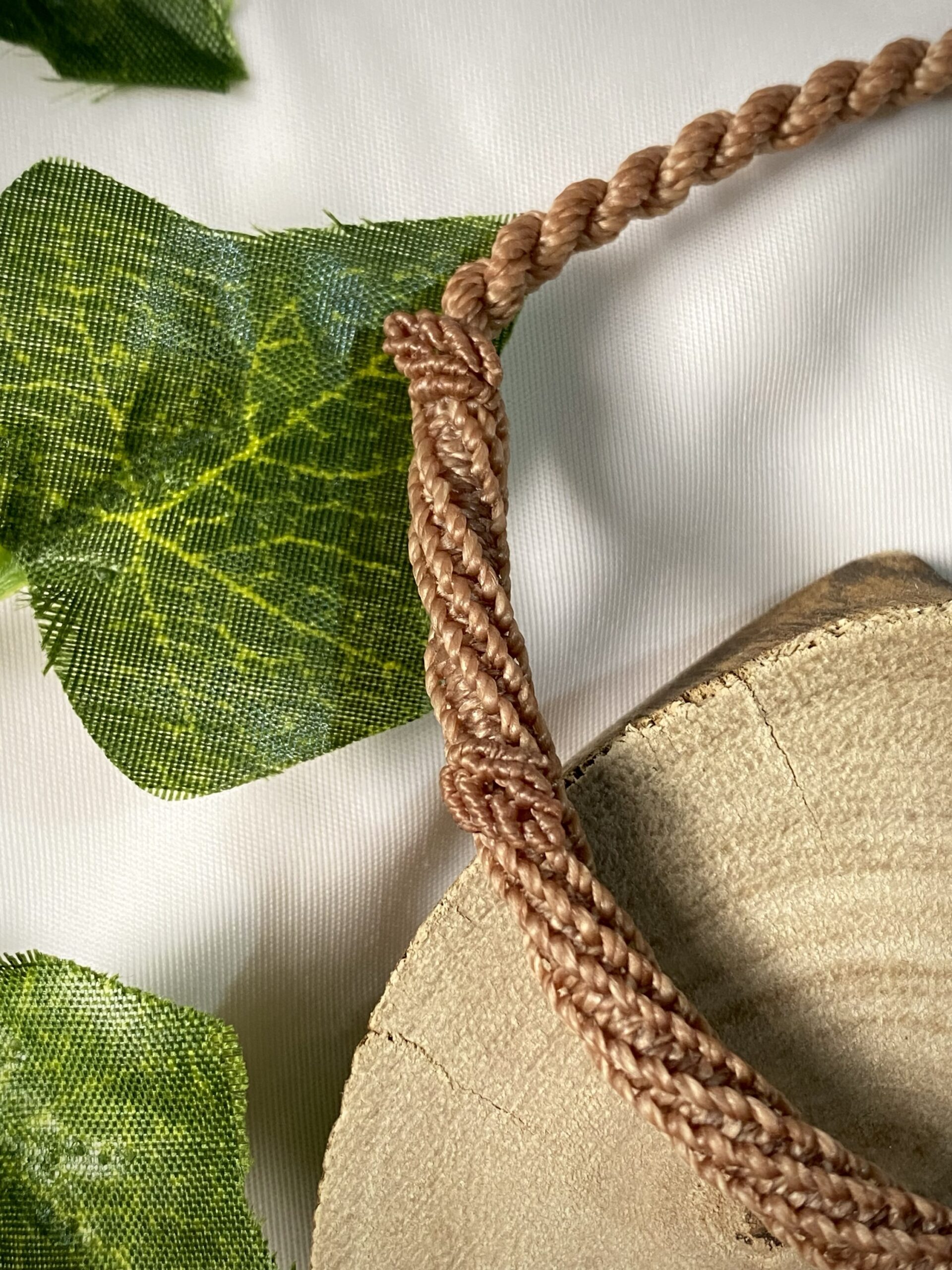 O design incorpora pequenas folhas feitas em nós delicados de macramê. Esses detalhes remetem à natureza e conferem fluidez, tornando o colar leve, orgânico e sofisticado.