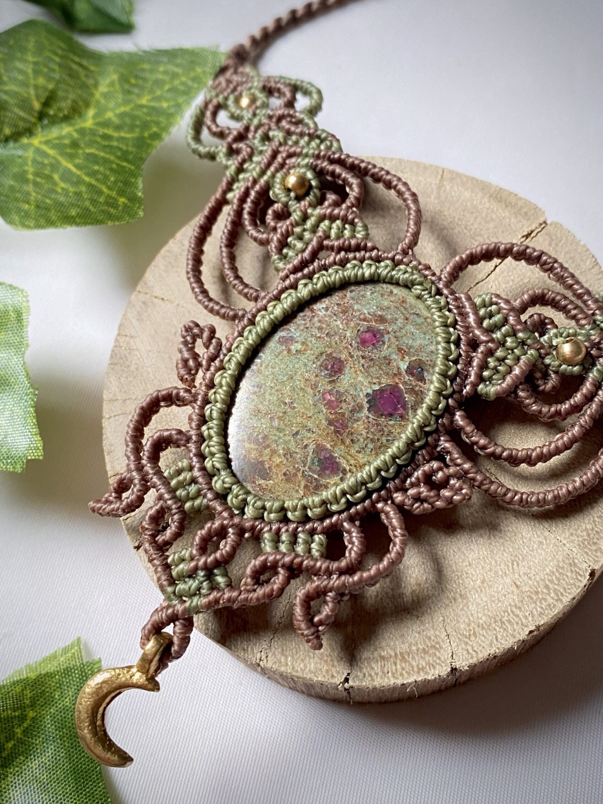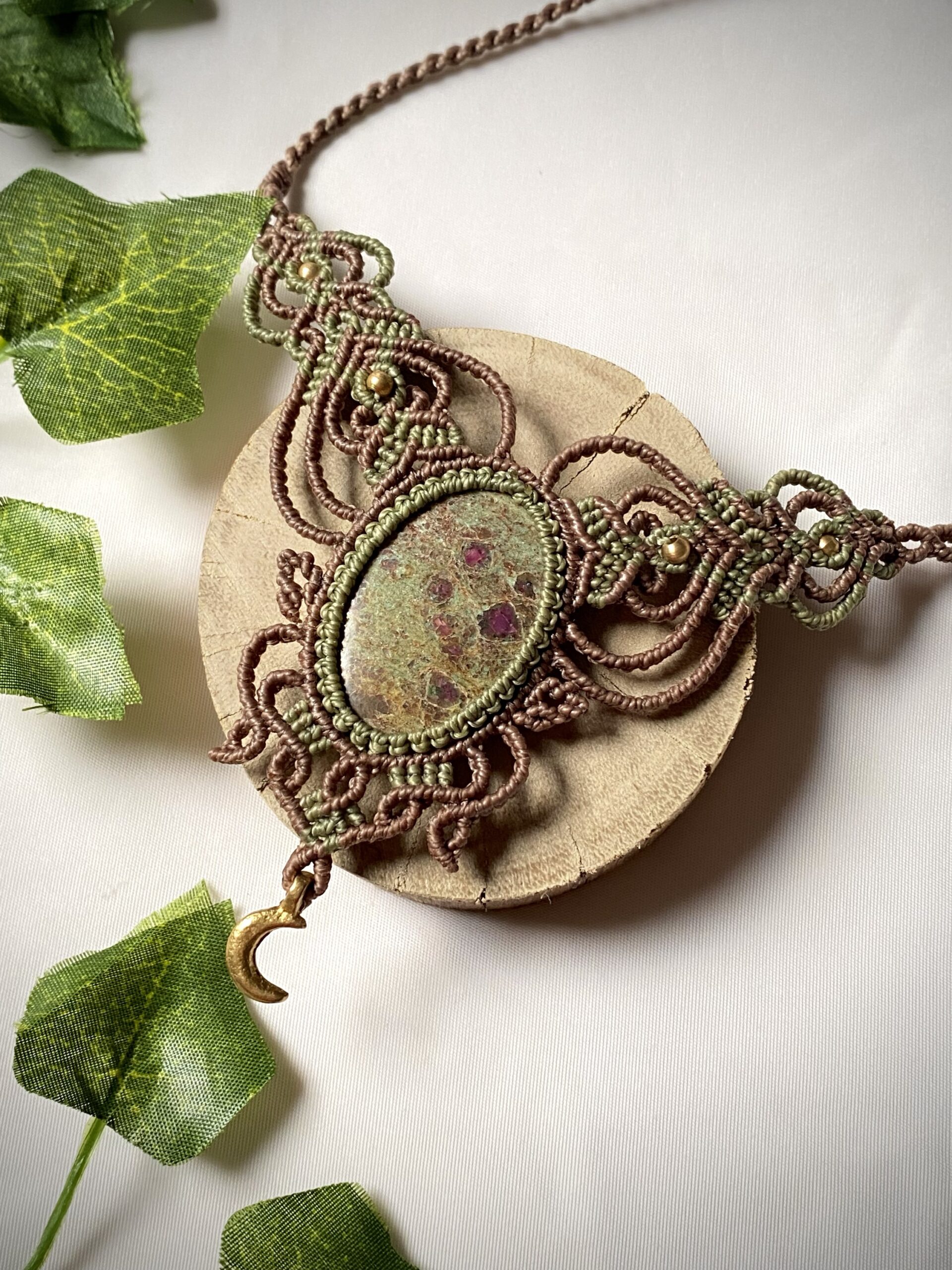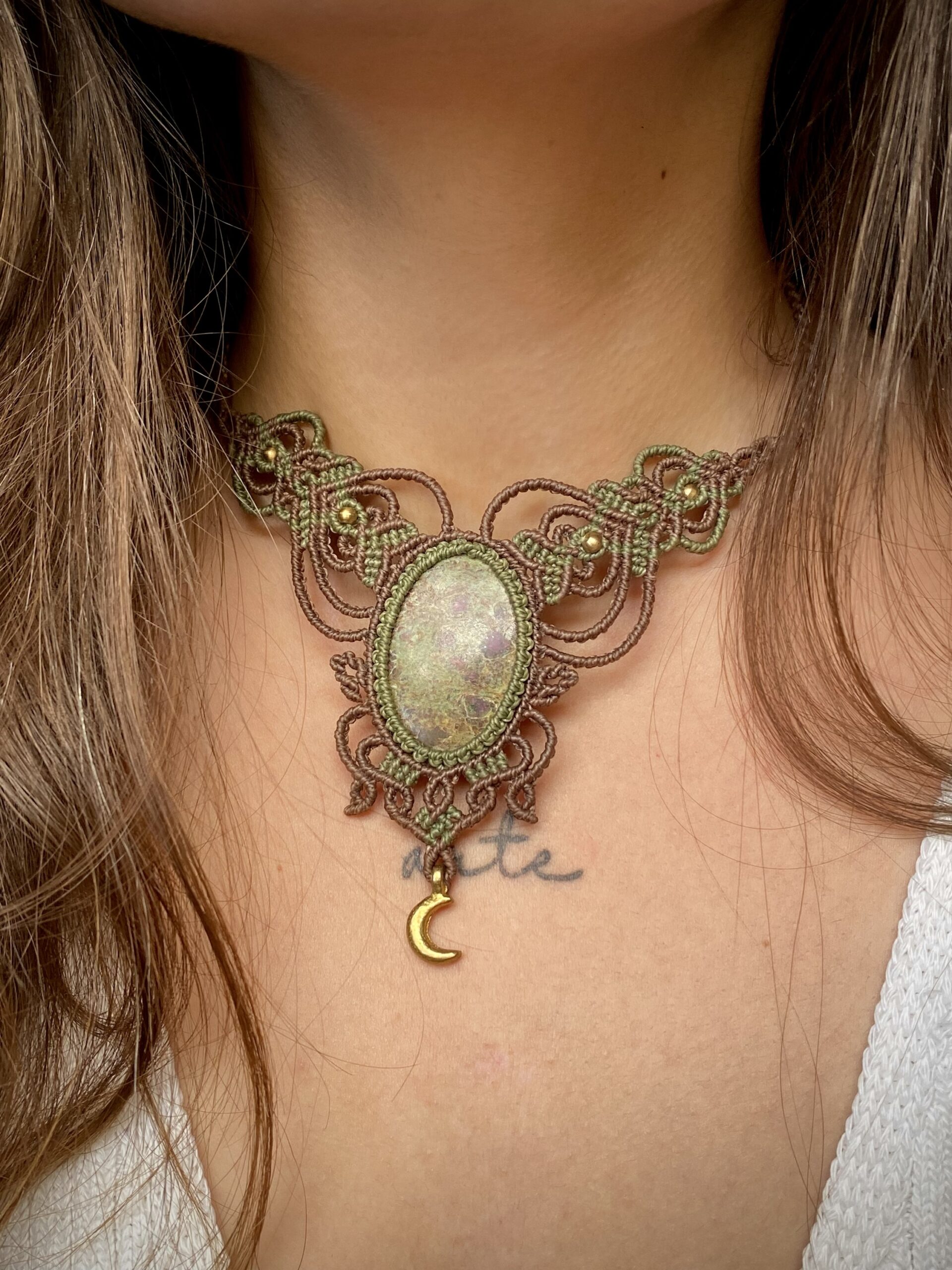 Produzido em fios de marrom claro e verde musgo fechado, o colar ganha um acabamento sofisticado, com nuances que destacam ainda mais a pedra natural. Essas cores terrosas e intensas remetem à natureza e trazem uma sensação de equilíbrio e conexão.