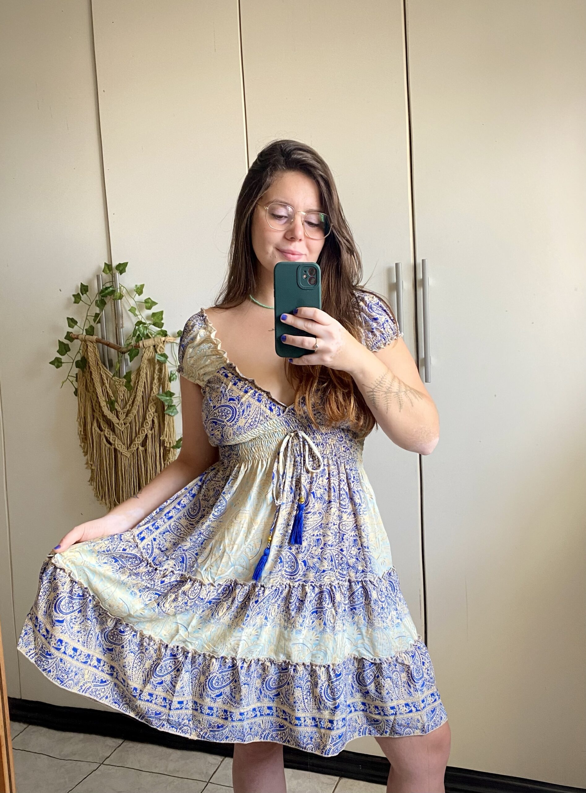 Delicado, leve e cheio de charme. O vestido curto em seda indiana nas tonalidades de azul e verde água combina elegância e frescor em uma peça única, perfeita para dias de calor e ocasiões especiais. Seu tecido fluido oferece um caimento suave e confortável, valorizando o corpo com leveza.