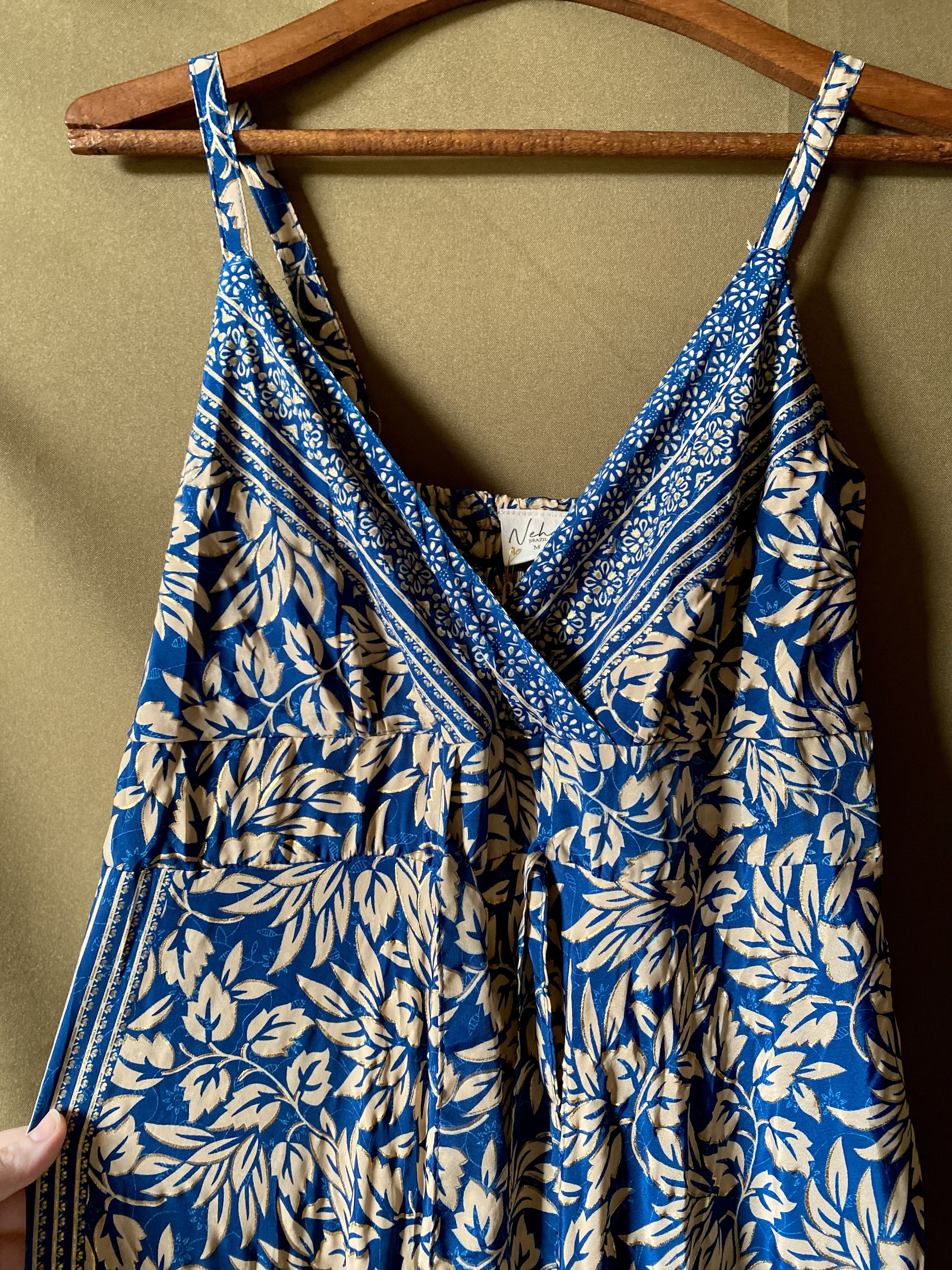 Elegante, leve e sofisticado. O vestido longo em seda indiana combina tons de azul e branco com fios dourados sutis, criando um visual delicado e refinado. Seu tecido fluido e brilhante confere movimento e elegância, perfeito para ocasiões especiais ou dias que pedem um toque de charme.