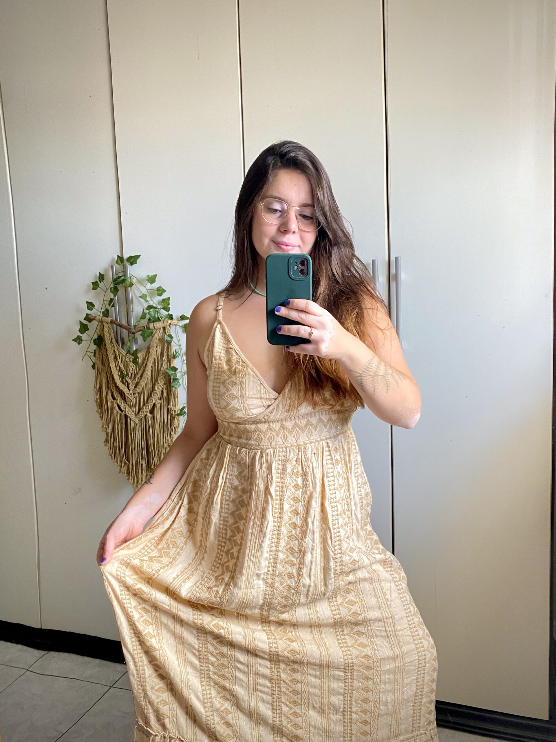 O equilíbrio perfeito entre conforto e estilo. O vestido longo Boho em tonalidades de bege claro é uma peça leve, sofisticada e versátil, ideal para compor looks elegantes e descontraídos em qualquer ocasião.